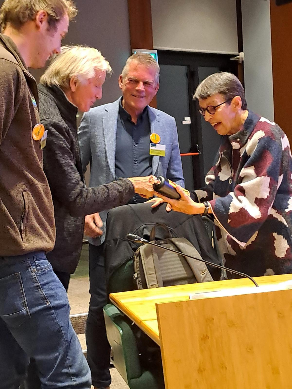 foto: Jurylid en commissaris van de Koning in Drenthe Jetta Klijnsma krijgt een flesje jenever van de Groninger Genever Stokerij aangeboden door Albert Kersies. Verder links op de foto Dirk Matthijs Meijberg van Landschapsbeheer Drenthe en voorzitter Pieter Posthumus (midden) van het Jeneverbesgilde.